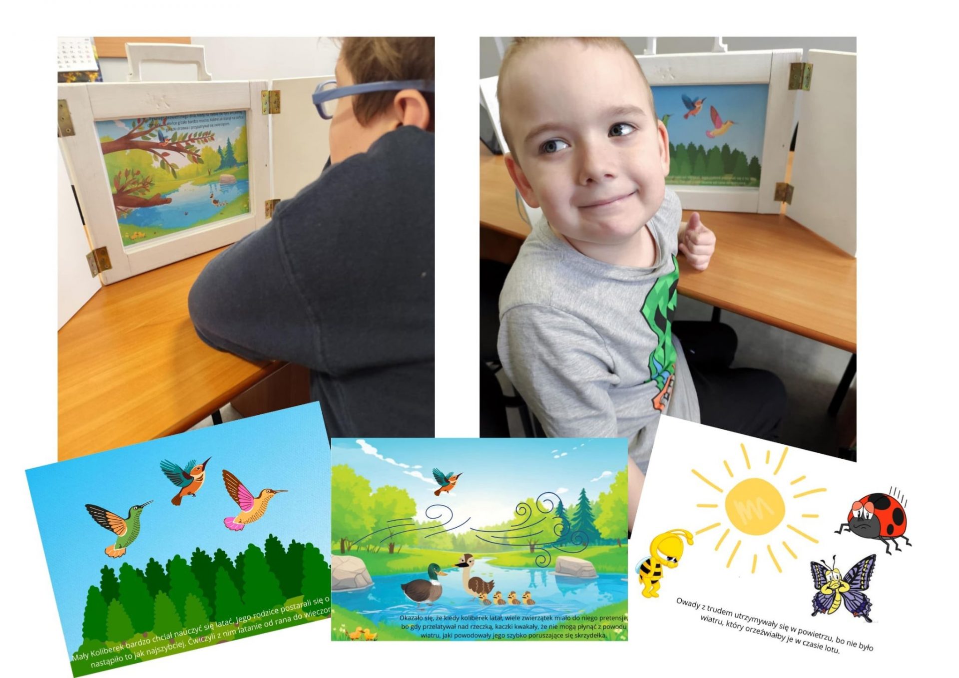 W marcu na zajęciach z bajkoterapii uczniowie słuchali terapeutycznej bajki M. Berger pt.: „Mały koliberek”. Bohaterem bajki jest mały koliber, który ma problemy z akceptacją siebie oraz trudności ze znalezieniem przyjaciół. W ramach Ogólnopolskiego Projektu Edukacyjnego „Gramy zmysłami” uczniowie wykonali z pianki plastycznej kwiatowe broszki, które później smarowały zapachowym olejkiem pobudzając zmysł węchu.