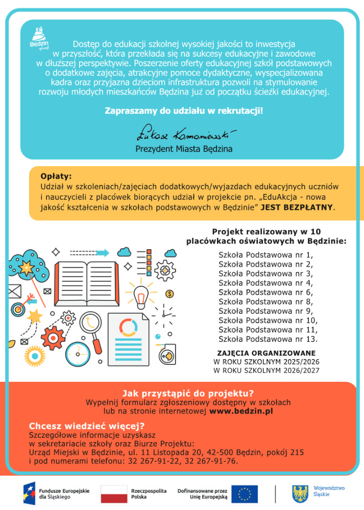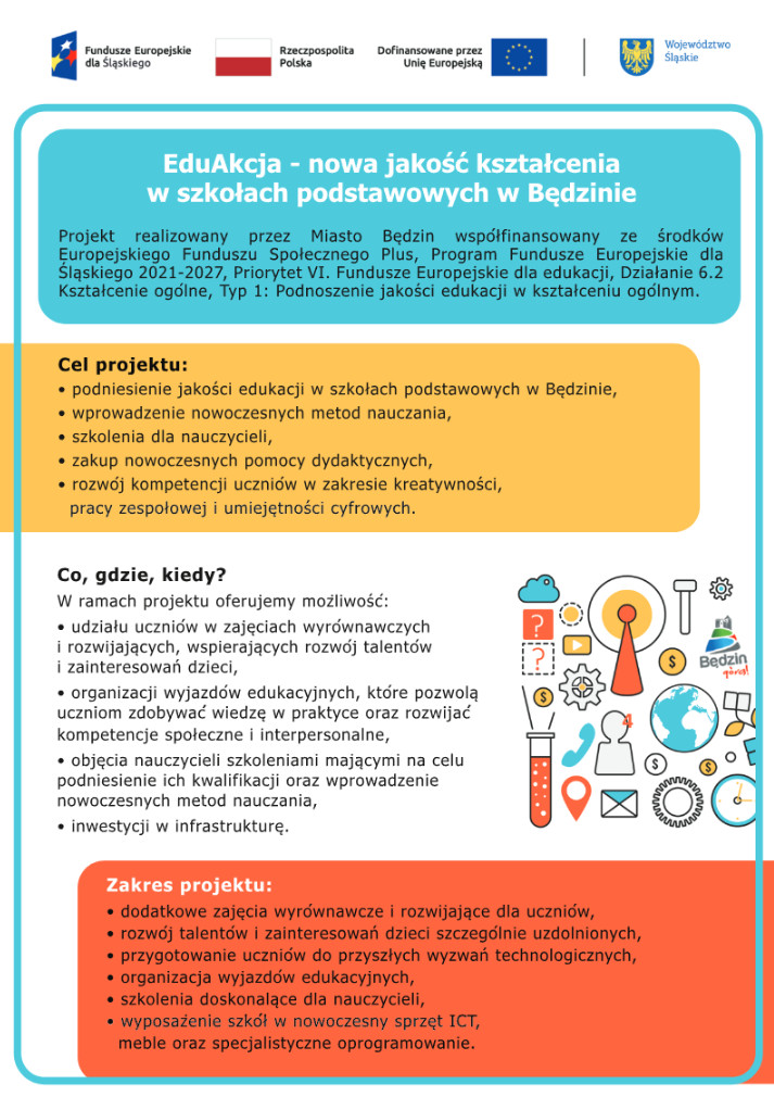 Miło nam poinformować, że nasza szkoła bierze udział w projekcie „EduAkcja”, którego celem jest podniesienie jakości edukacji w szkołach podstawowych w Będzinie. „EduAkcja” to inwestycja w rozwój kompetencji uczniów i nowoczesne metody nauczania, która sprawi, że nauka stanie się jeszcze ciekawsza i bardziej efektywna. Szczegółowe informacje o projekcie